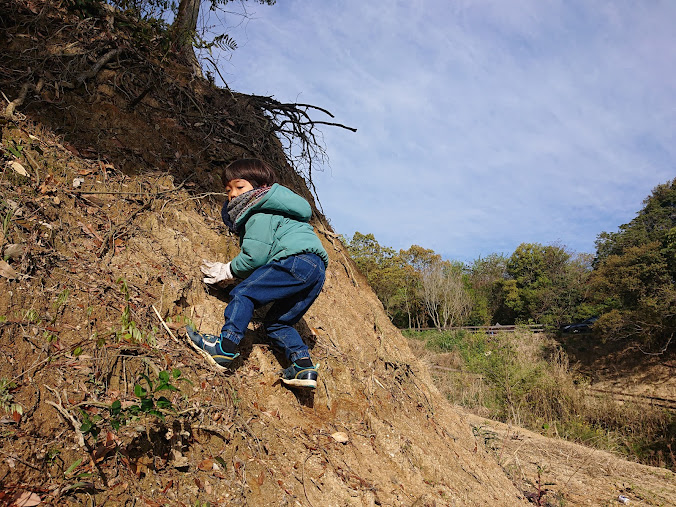 あくまで息子に好きなように登らせつつ、落っこちたときいは受け止めてあげれるように、父は坂の下でスタンバイです。