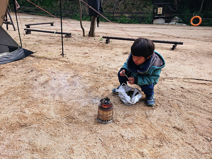 とのことだったので、一緒に小枝をひろって小さい焚き火台で朝から焚き火