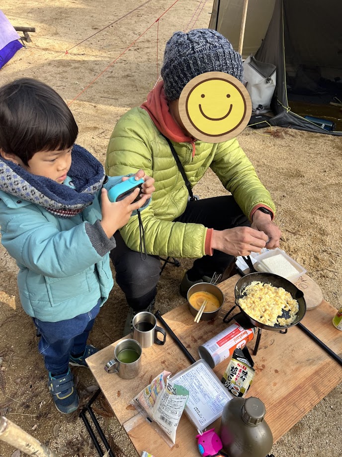 がけ登りごっこを楽しんだあとは、テントに戻り朝ごはんにします。